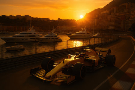 Golden Formula One race car on track during sunset, with yachts in harbor and buildings on hillside in background. Stunning location for prestige sport event. Concept of sport, race, competition