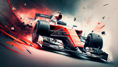 A dramatic scene of formula car crashing with debris flying during competition event. Dangerous sport