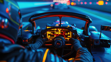 Professional racing car driver driving surrounded with panel while holding car steering wheel with blurring background. Hand on the wheel and driving high speed. First person point of view. AIG42.
