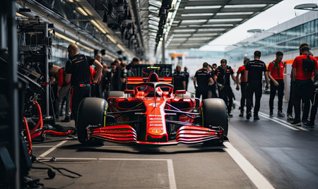 Formula 1 pit stop, accuracy and coordination of mechanics, quick service of a racing car. Generative AI