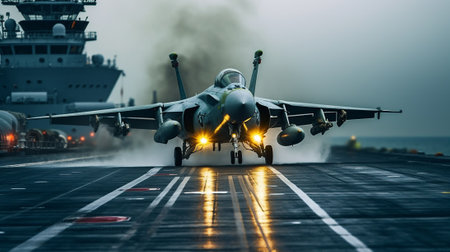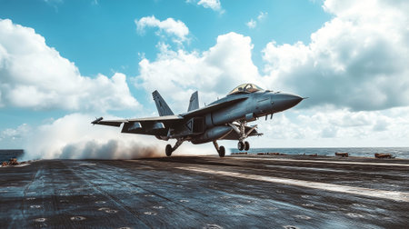Military aircraft is launching from carrier deck, highlighting powerful engines and dynamic motion, with blurred surroundings enhancing the sense of speed and aviation innovation