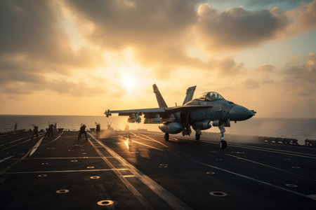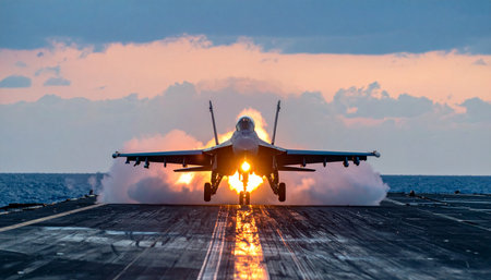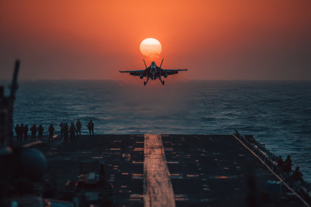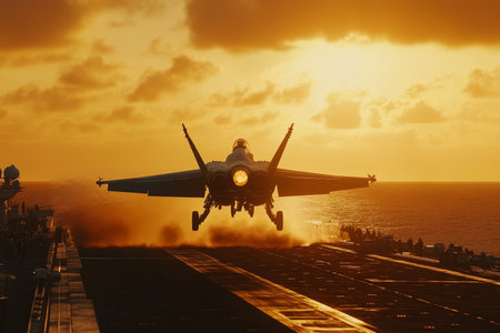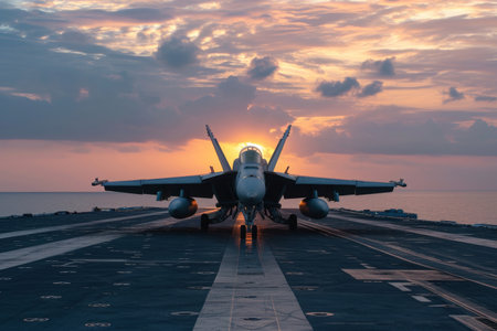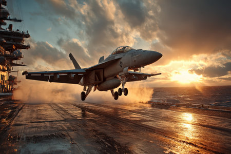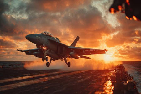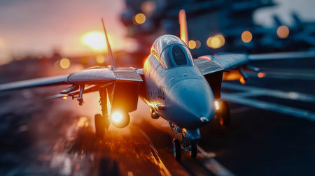 Military jet launches from carrier deck against a vibrant sunset, highlighting dynamic motion and powerful engines, creating an atmosphere of excitement and innovation