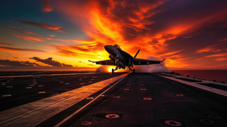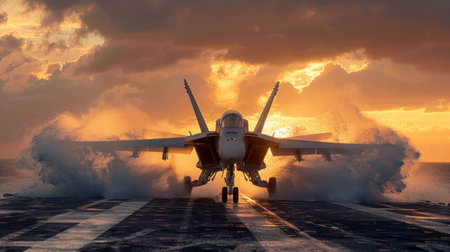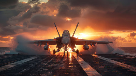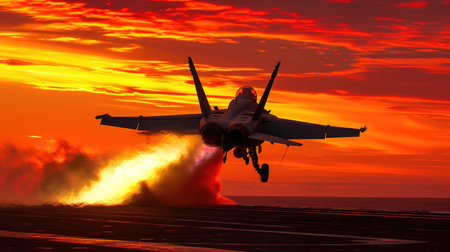 Military aircraft launches from carrier deck, surrounded by vibrant sunset colors and dynamic exhaust flames, capturing the essence of aerial strength and technology