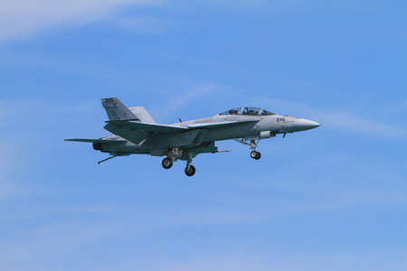 Farnborough, UK - July 20, 2014: United States Navy Boeing F/A-18F Super Hornet multirole fighter aircraft.
