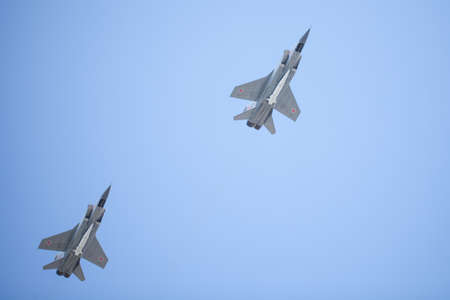 Moscow, Russia - May, 05, 2021: Four MIG-31K, Foxhound, with Kh-47M2 Kinzhal missle flying over Red Square during the preparation of the May 9 parade.