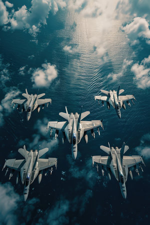 A Fighter jets soar in tight formation above the ocean, reflecting precision and military power