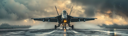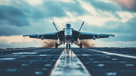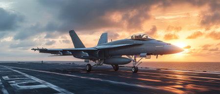 Military jet is launching from aircraft carrier deck during sunset, with dynamic clouds and ocean backdrop, highlighting strength and precision in aviation
