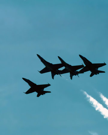 A Jet Fighters in V-Formation with Contrails, Warplanes in Sky Combat Scene