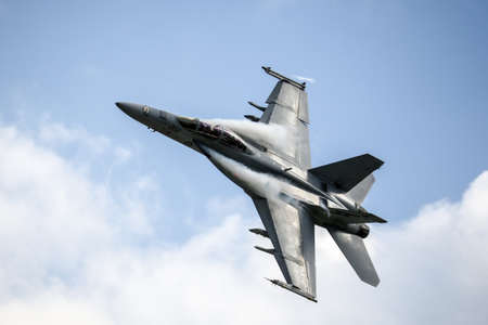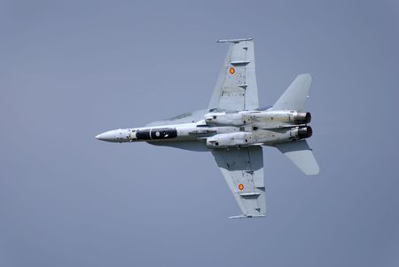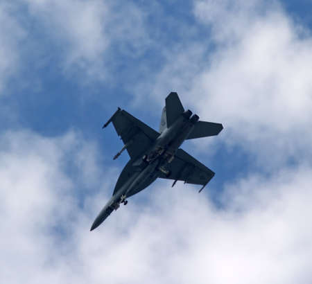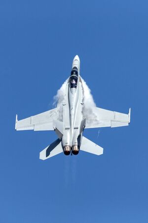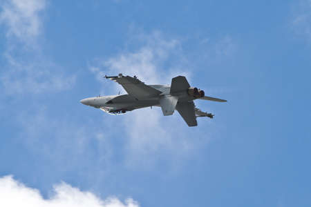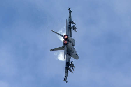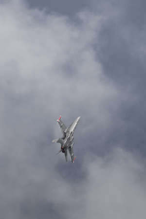 Farnborough, England, UK - July 24, 2010: US Navy Boeing F/A-18 Hornet inverted during Farnborough 2010 Airshow.