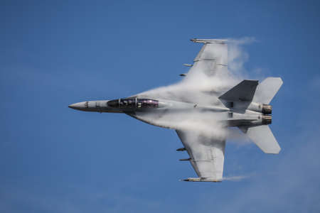 SAN FRANCISCO, CA - OCTOBER 7: VFA-122 Boeing F/A-18F Super Hornet aircraft surrounded in vapor cone during 2011 Fleet Week on October 7, 2011 in San Francisco, CA.