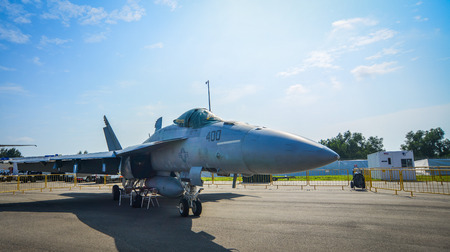 Singapore - Feb 10, 2018. A McDonnell Douglas F-15SG Strike Eagle aircraft belong to the US Air Force sits on display at the 2018 Singapore Airshow.