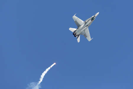 Avalon, Australia - February 28, 2015: Royal Australian Air Force (RAAF) McDonnell Douglas F/A-18A Hornet multirole fighter aircraft A21-3 from 3 Squadron RAAF Williamtown firing countermeasures flares.