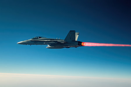 A military fighter jet is soaring through the clear blue sky, showcasing its speed with a visible afterburner flame. The strategic flight demonstrates advanced aerial capabilities.