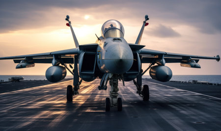 Fighter jet prepares for takeoff on aircraft carrier deck against sunset backdrop