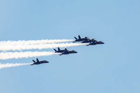New York, NY / USA - 4/28/2020: Airforce and navy Thunderbirds and Blue Angels fly over Manhattand and Philadelphia to support medicine workers during covid pandemy