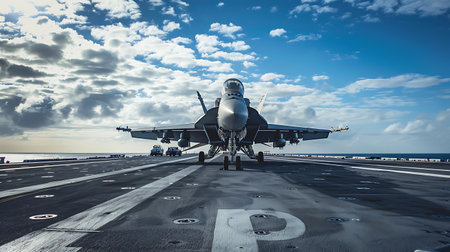 A fighter jet on an aircraft carrier with a cloudy sky. The jet is in focus, facing the camera. The background is slightly blurred. The image is well-lit with vibrant colors.
