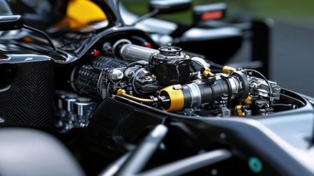 A high-performance racing engine is displayed, highlighting intricate components and advanced technology. The setting emphasizes precision engineering in motorsport.