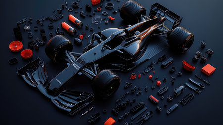 This striking image showcases a detailed breakdown of a Formula racing car, featuring an array of components meticulously arranged on a dark backdrop.