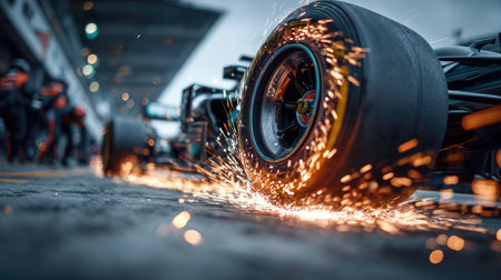 A vivid depiction of a Formula 1 pit stop, showcasing tire changing with spectacular sparks flying, capturing the energy and teamwork of racing dynamics.