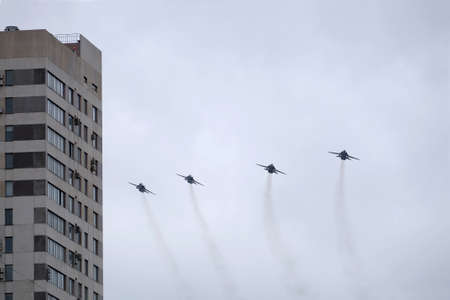MOSCOW, RUSSIA - May 9, 2021: Group of four Russian military tactical frontline bombers SU-24 fast flying close to dwelling building during parade rehearsal