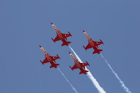 KONYA, TURKEY - JUNE 26, 2019: Turkish Air Force aerobatic demonstration team Turkish Stars in Konya Airport during Anatolian Eagle Air Force Exercise