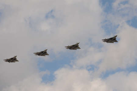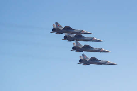 Moscow - May 9, 2015: Four military aircraft MiG-31 flying formation at the Parade of Victory over Nazi Germany May 9, 2015, Moscow Russia