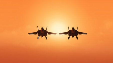 Experience the exhilarating moment as two jets soar together, silhouetted against an extraordinary orange sky, epitomizing teamwork and precision in aviation.
