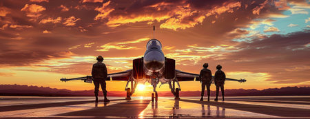 A sleek F20 fighter jet awaits on the runway, silhouetted against a breathtaking sunset while crew members stand nearby, creating a striking visual moment.