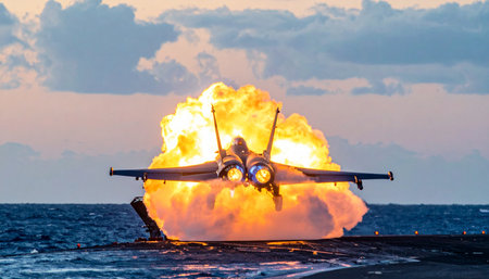 A naval fighter jet erupts in a ball of fire as its afterburners ignite for a powerful catapult launch from an aircraft carrier deck. The dramatic scene at sunset captures the immense force and advanced technology of modern military aviation.