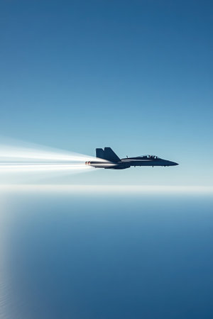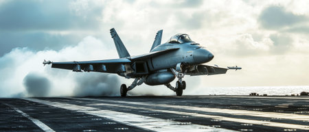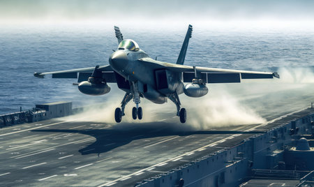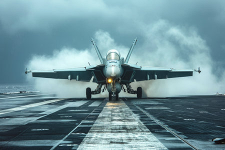 Military aircraft is launching from carrier deck, highlighting powerful engines and dynamic motion, with blurred surroundings enhancing the sense of speed and aviation innovation