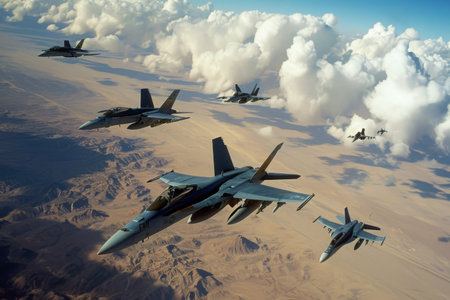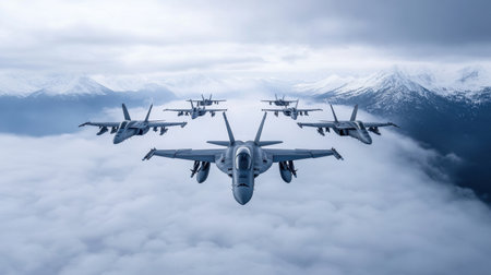 Several fighter jets flying in close formation, representing military power, precision, and aerial coordination.