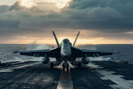 Military jet is launching from aircraft carrier deck during sunset, with dynamic clouds and ocean backdrop, highlighting strength and precision in aviation
