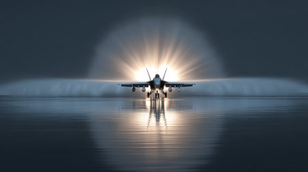 A stunning fighter jet takes off at dawn, creating striking reflections on the calm water surface. The dramatic light enhances the awe-inspiring scene.
