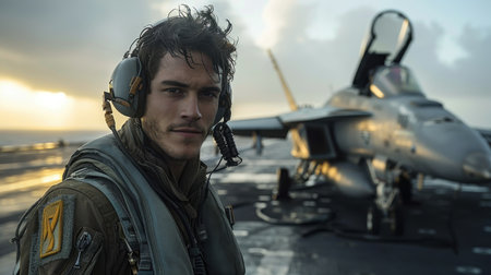 View of the silhouette of a military pilot standing on an aircraft carrier
