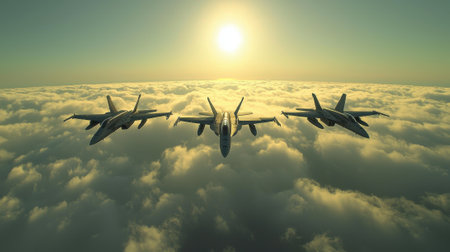 Three military jets soar high above a sea of clouds, illuminated by the warm glow of a setting sun. The aircraft create a striking formation under the colorful sky, showcasing their power.