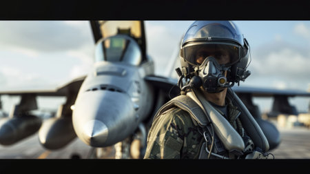 The picture of the air force pilot in flight gear standing near the jet fighter, the pilot require skills like combat tactics, situational awareness, physical fitness and continuous training. AIG43.