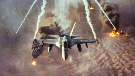 A fighter jet flies through the air, leaving a trail of smoke and fire in its wake. The jet is flying over a desert landscape, and the sun is shining brightly.