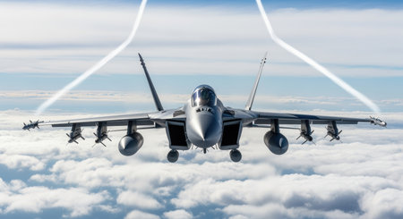 Modern fighter jet soaring above dense clouds with vapor trails and advanced weaponry under bright daytime blue sky.