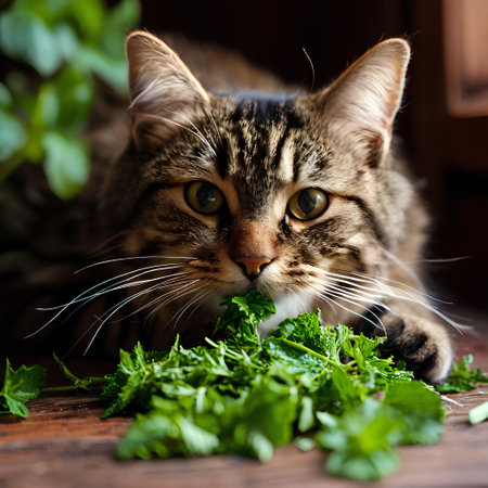 cute striped kind cat eats catnip. cat happiness.