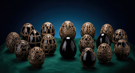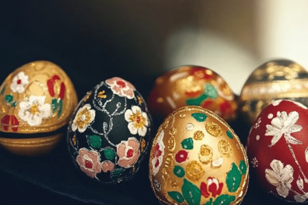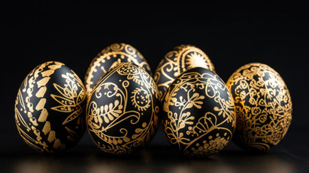 Close-up of ornate, dark-colored Easter eggs with golden and purple floral patterns. Festive and elegant.