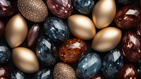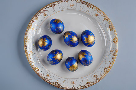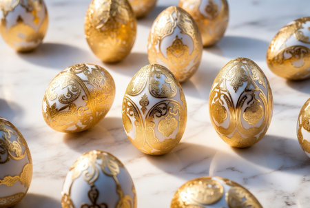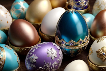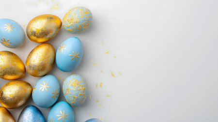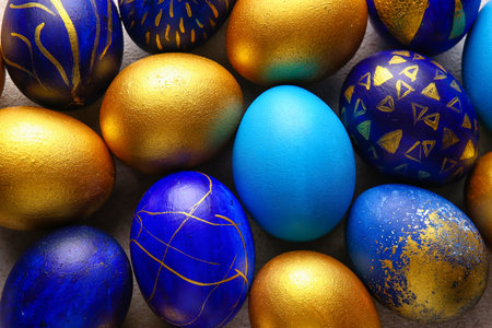A collection of beautifully decorated Easter eggs in gold and blue hues, creating a festive and elegant spring scene.