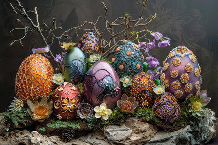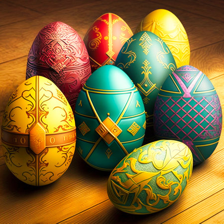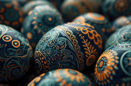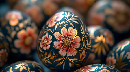 Close-up of hand-painted Easter eggs with intricately floral patterns. Vibrant colors and detailed designs.