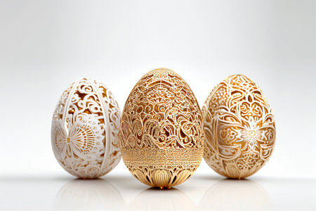 Three golden Easter eggs with filigree detail on a white background with reflection and shadow. Generative AI