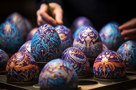 Close-up of intricately painted Easter eggs with floral motifs. Dark blue eggs with gold accents and red flowers.