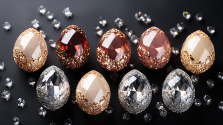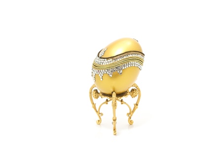 Easter egg decorated with precious stones on a wooden stand, close-up