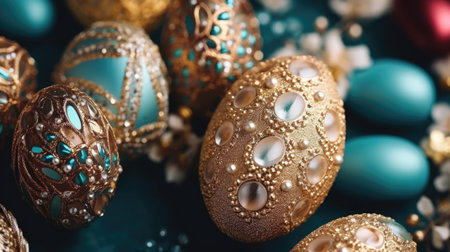 Close-up of intricately painted teal and gold Easter eggs. Beautiful patterns and textures.