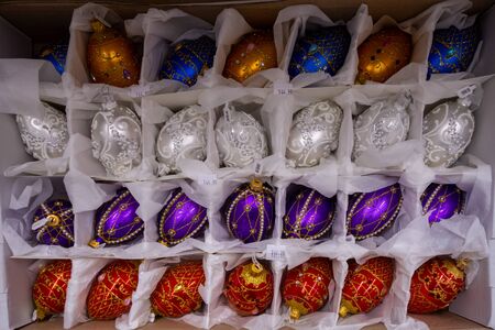 Christmas-tree decorations of different shapes and colors in packaging on a store shelf. 2019.04.12. Odessa. Ukraine