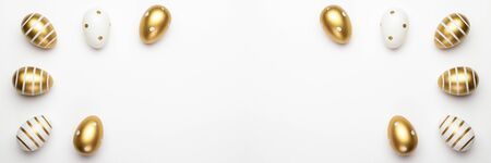 Trendy easter banner with golden decorated eggs on white background with copy space. Modern, art deco style layout. Flat lay. Stylish easter concept.