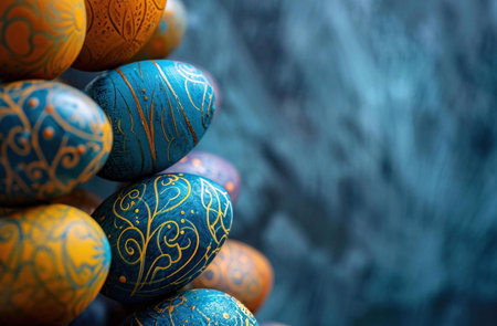 Close-up view of a stack of beautifully decorated Easter eggs in shades of blue, gold and orange with intricate patterns.