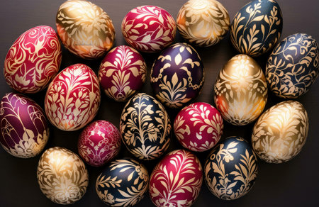 Close-up view of many intricately decorated Easter eggs, featuring elegant gold, red, and purple designs on a dark background.